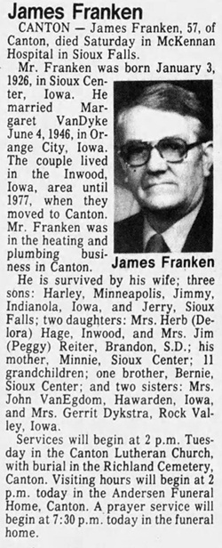 Mr. Franken, a son of the late Mr. and Mrs. Aalt Franken, was born at Sioux Center on April 12, 1896. He married Minnie Vande Weerd at Rock Valley March 19, 1915. He spent his entire life In Sioux county, farming north of Hawarden the past 16 years prior to which he farmed in the Sioux Center and Rock Valley vicinities.