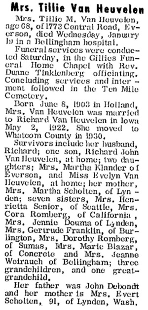 Zoon van Rijndert van Heuvelen en Bartha van de Weerd, geboren 29-8-1897 18:00 NL Ede [360], overleden 16-8-1962 USA WA Bellingham en begraven Lynden Ten Mile CemeteryTrouwt 1922 Teuntje Margaretha (Tillie) De Bondt, zoon van Jan de Bondt - metselaarsknecht en Maartje Jansen, geboren 8-6-1903 NL Ede [285], overleden 19-1-1972 USA WA Bellingham en begraven bij man