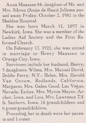 Zoon van Johannis (John) Maassen Sr en Gertie Harmens (Gerritje) Van De Weerd, geboren 22-10-1896 NL Bunnik [34], overleden 17-5-2001 USA IA Sheldon en begraven East Lawn CemeteryTrouwt 17-2-1922 USA IA Orange City Anna Jellema, dochter van Siebren Jellema en Antje (Anna) De Haas, geboren 31-3-1897 USA IA Newkirk, overleden 2-10-1981 USA IA Sheldon en begraven bij man