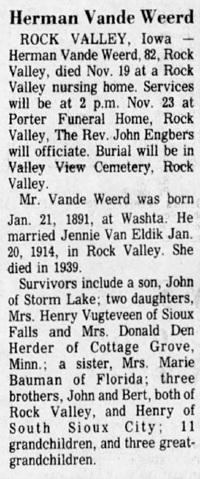 Zoon van Jan (John) van de Weerd Sr en Hendrika Buitenhuis, geboren 21-1-1891 USA IA Washa, overleden 19-11-1973 USA IA Rock Valley en begraven Valley View CemeteryTrouwt 20-1-1914 USA IA Rock Valley Jennie Van Eldik, dochter van Dirk (Dick( Van Eldik en Nellie (Pietje) van der Velden geboren 23-4-1894 USA IA Rock Valley, overleden 22-5-1939 USA IA Rock Valley en begraven bij man